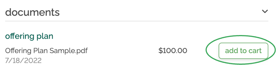 Documents available for purchase have prices listed next to them. Select Add to Cart to purchase.